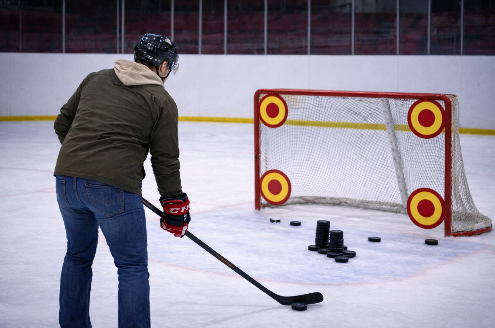 You will step onto the ice and perform a series of shots at the targets inside the goal.